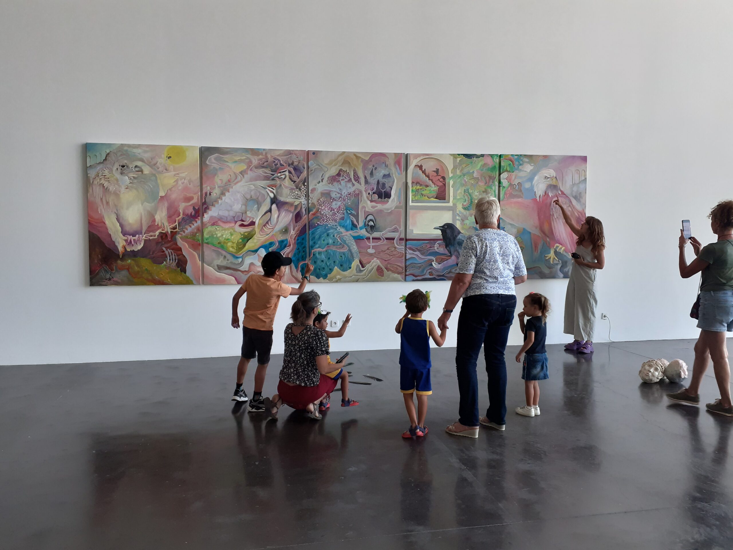 Il s’agissait cette fois d’une déclinaison spécialement conçue et destinée aux tous petits de l’exposition de Madison Bycroft : « Les mensonges du météorologue ». Un voyage onirique où se confond l’homme et l’oiseau, le mensonge et la vérité.